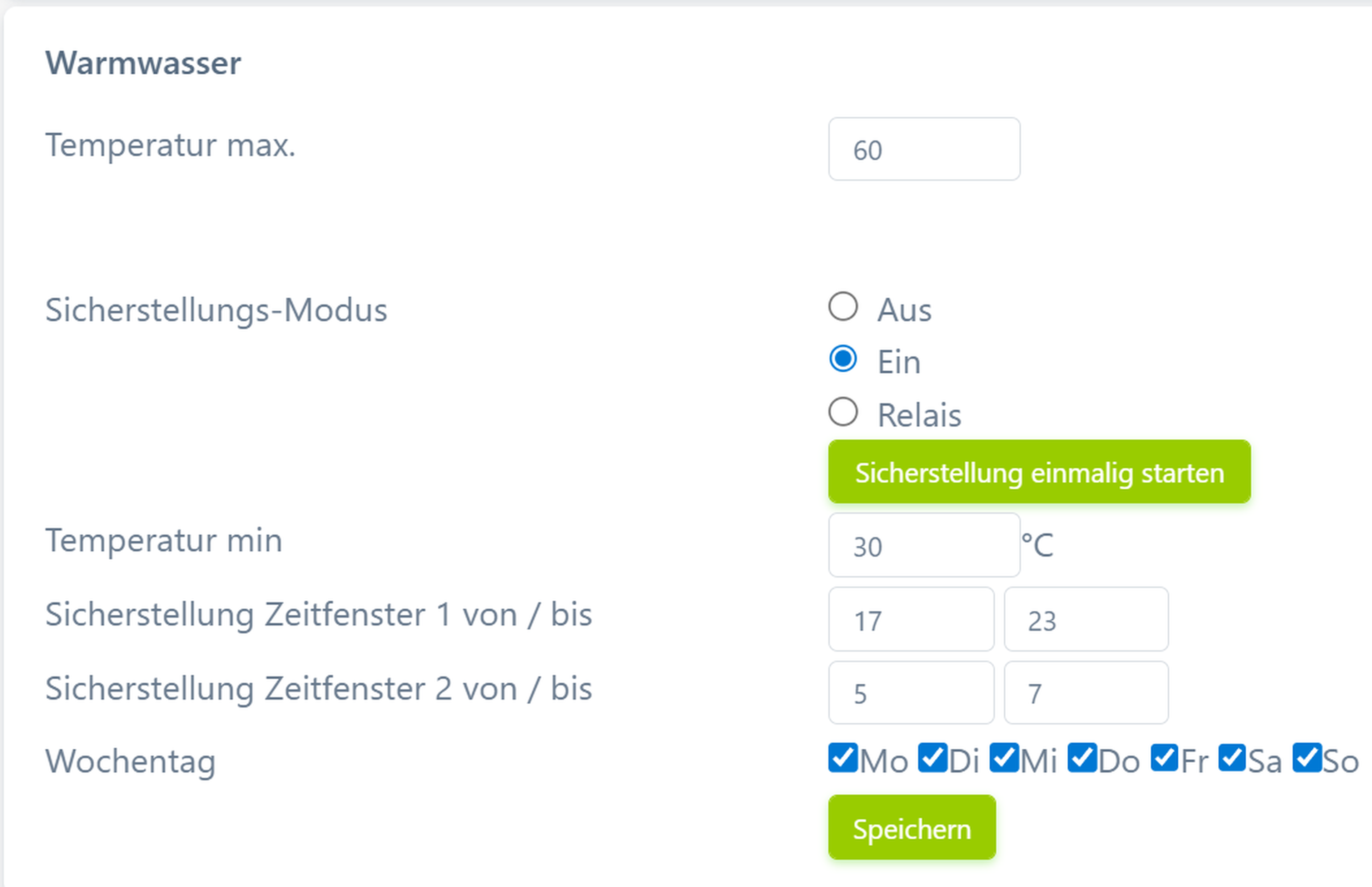 Sie können die Zieltemperatur einstellen und den "Sicherstellungs-Modus" im Menü "Warmwasser" konfigurieren.