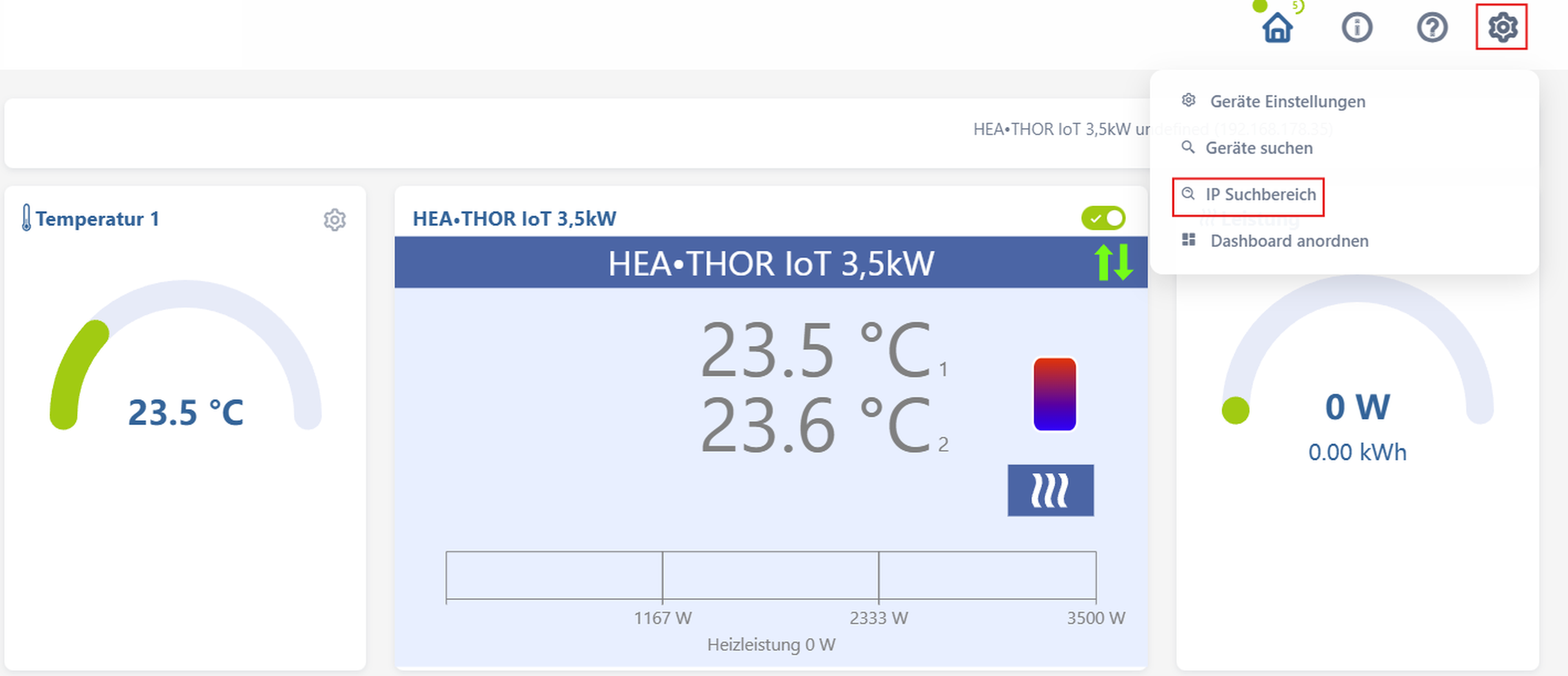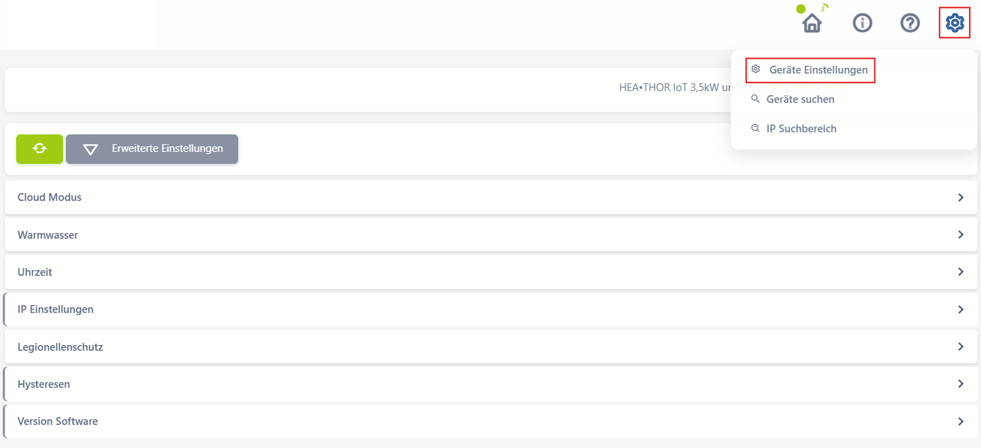 Über die "Geräte Einstellungen" im Websetup können Sie alle erforderlichen Einstellungen für den HEA•THOR IoT konfigurieren.