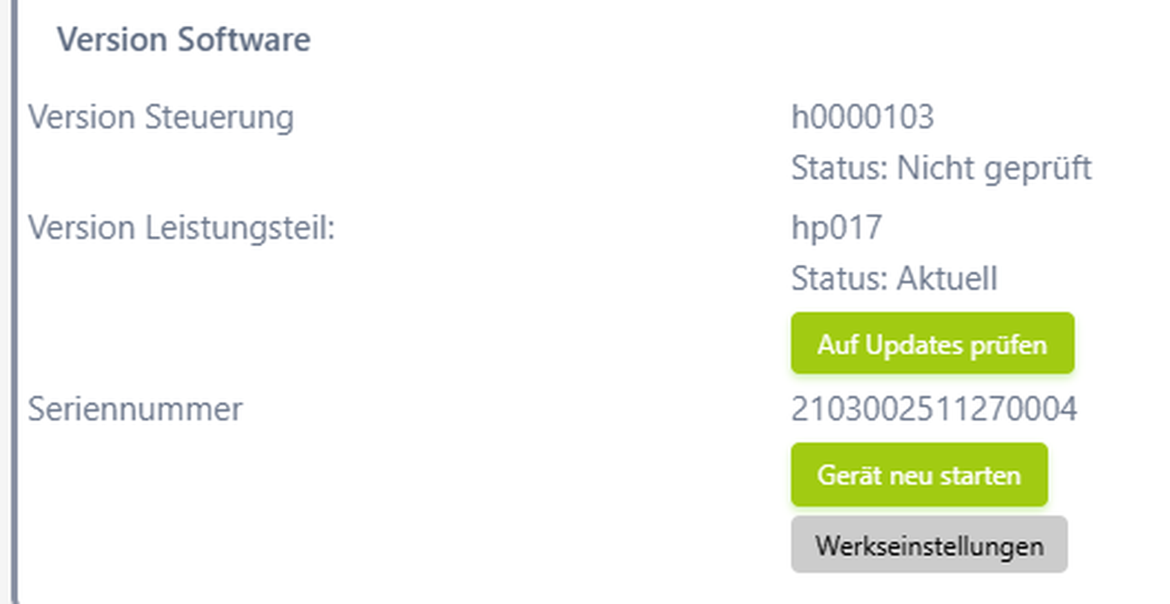 Im Menü "Version Software" können Sie die aktuelle Firmware-Version anzeigen, nach Updates suchen und Updates durchführen. Außerdem ist es möglich, den HEA•THOR IoT neu zu starten oder auf Werkseinstellungen zurückzusetzen.