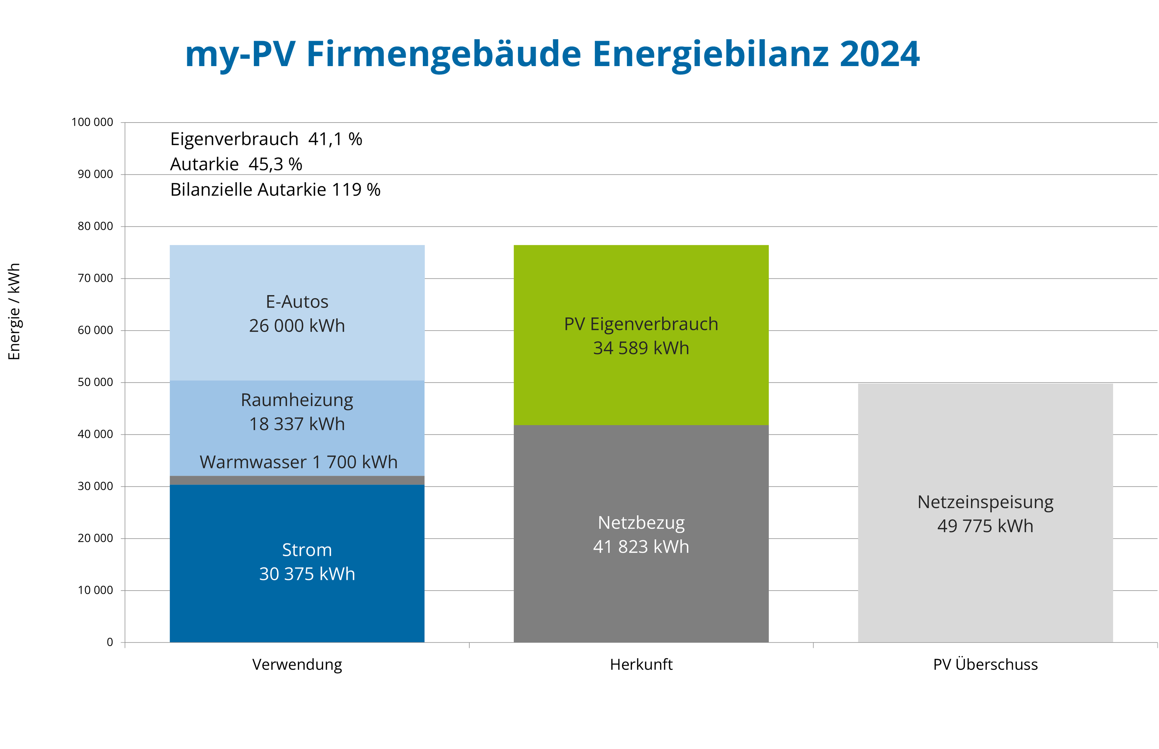 Da my-PV seinen Mitarbeitern kostenlose Lademöglichkeiten auf den Parkflächen anbietet und auch die Firmenflotte Zuwachs erhalten hat, stieg der Verbrauch in diesem Bereich von 14700 kWh auf 26000 kWh.