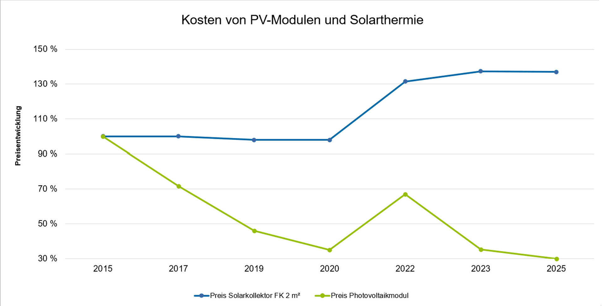 Seit 2015 vergleicht my-PV regelmäßig die Kosten von Photovoltaikmodulen mit Solarthermie-Flachkollektoren. Während die Preise für Solarthermie bis 2020 weitgehend stagnierten und seither aufgrund materialintensiver Komponenten wie Kupfer und Aluminium sogar steigen, hat die Photovoltaik eine beeindruckende Lernkurve hingelegt. Bis 2020 sanken die Modulpreise um rund 65 Prozent. Nach zwischenzeitlichen Anstiegen in den Jahren 2021 und 2022 setzte sich der Abwärtstrend fort – 2025 liegen die Kosten pro Watt Peak nahezu 70 Prozent unter dem Niveau von 2015.