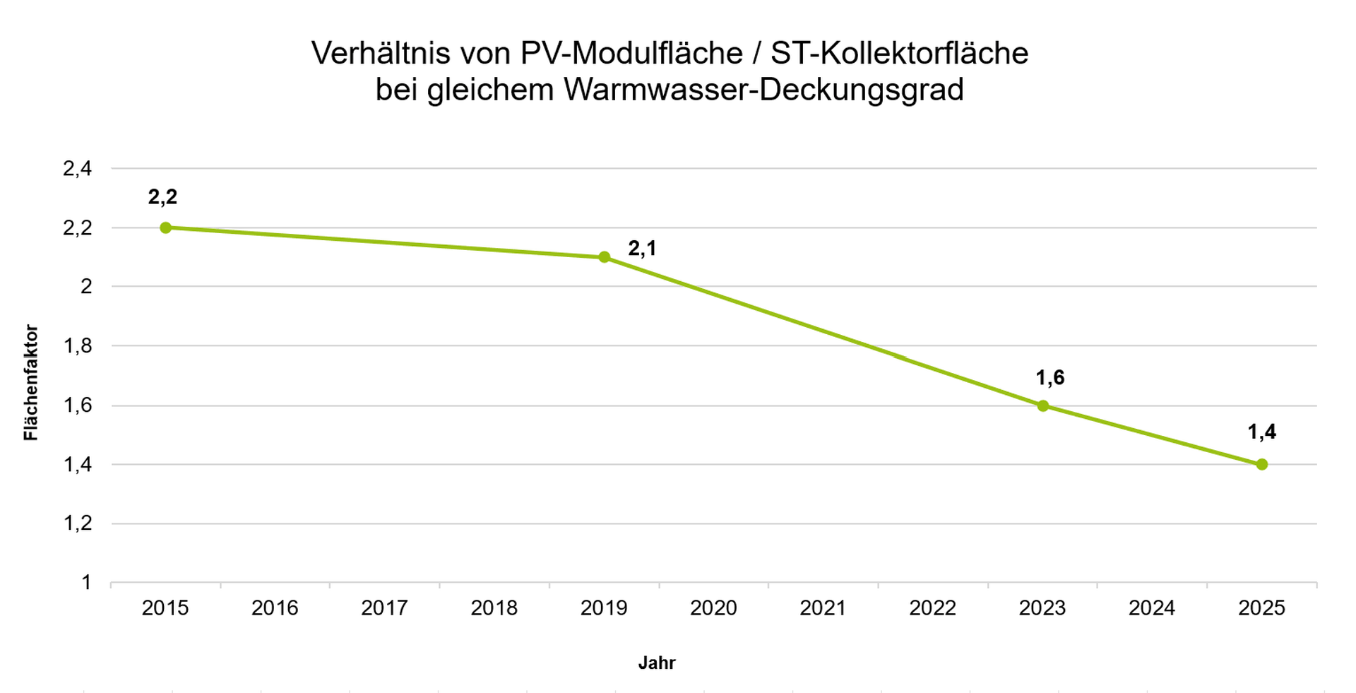 Auch beim Flächenbedarf hat sich das Bild deutlich verändert. Simulationen zeigen, dass 2015 noch rund 13,2 m² Photovoltaikfläche erforderlich waren, um den gleichen Warmwasser-Deckungsgrad wie 6 m² Solarthermie zu erreichen. 2025 genügen dafür nur noch etwa 8,6 m² Photovoltaik. Der frühere Flächenvorteil der Solarthermie ist damit nahezu verschwunden – in der Praxis spielt er bei den meisten Eigenheimen keine Rolle mehr.