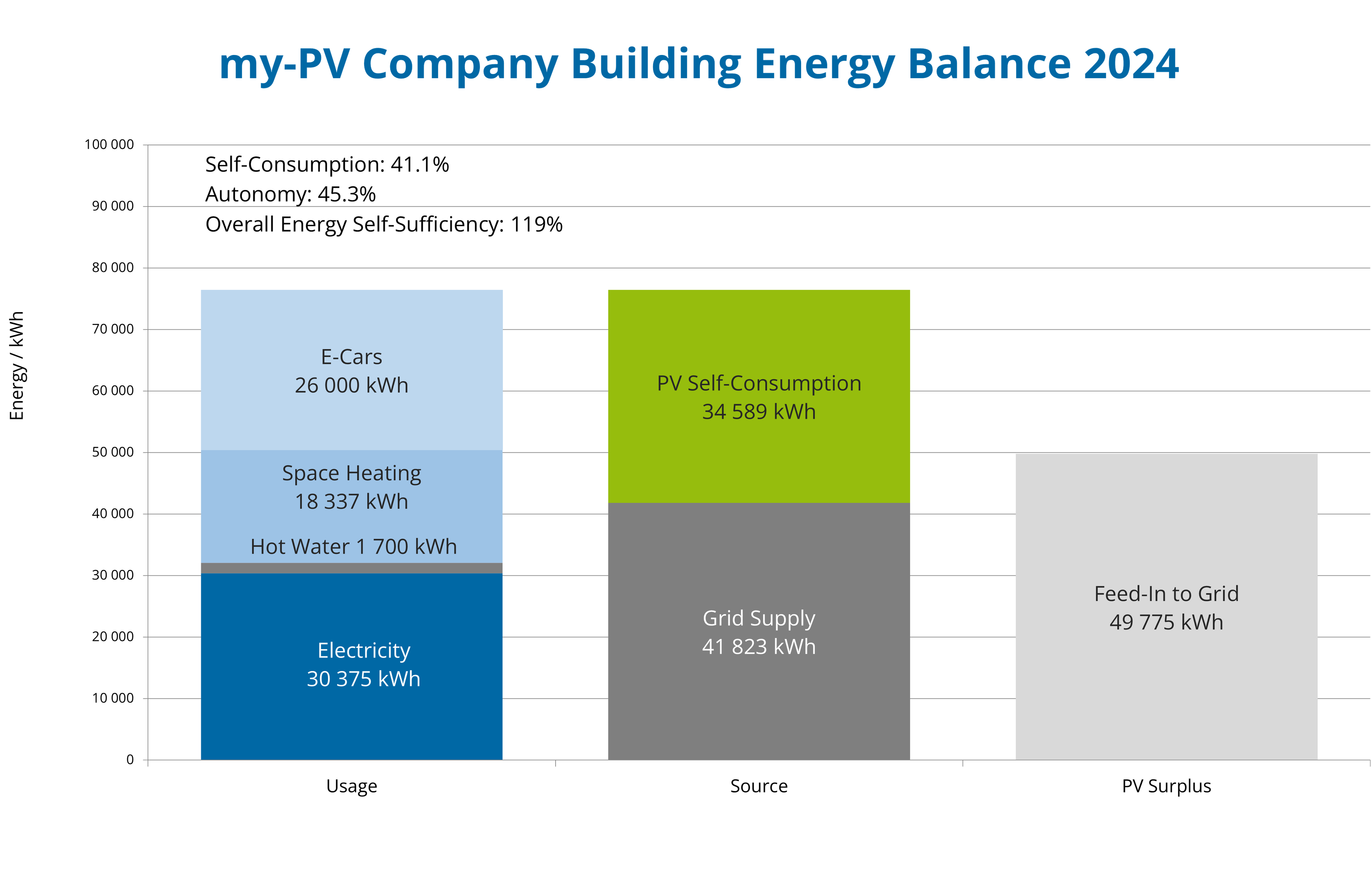 Hot water demand also rose by 700 kWh due to the increase in staff. However, the largest increase was observed in e-mobility. Since my-PV provides free charging for employees in the parking areas and the company fleet has expanded, consumption in this sector increased from 14,700 kWh to 26,000 kWh.